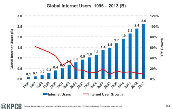 Bản báo cáo Internet Trends 2014 164 trang do “nữ hoàng Internet” Mary Meeker và đội ngũ tại KPCB thực hiện cho thấy, mức tăng trưởng người dùng Internet trên toàn cầu đã xuống dưới mức 10% và có tốc độ tăng trưởng chậm dần. Đến hết năm 2013, số người sử dụng Internet trên toàn cầu đạt 2,6 tỉ, tăng 200 triệu so với năm 2012.