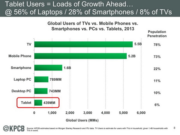 Năm 2013, người dùng tablet đã đạt mức 439 triệu, vẫn còn ít so với 743 triệu người dùng desktop và 789 triệu dùng laptop.