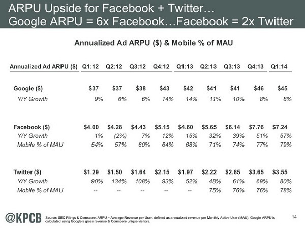 Qua bảng số liệu bên dưới, bạn đọc sẽ thấy rõ doanh thu trung bình trên một khách hàng (ARPU) của Google gấp 6 lần Facebook, và mạng xã hội Facebook gấp 2 lần so với Twitter.