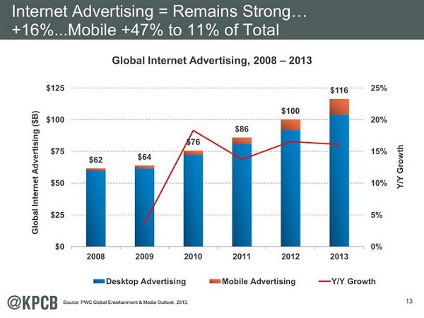Xu hướng di động hóa đã thúc đẩy doanh thu của ngành quảng cáo di động bùng nổ, tăng trưởng đến 47%. Di động bắt đầu nắm giữ 11% trong tổng doanh thu 116 tỉ của ngành quảng cáo trực tuyến năm 2013. Ba ông lớn nắm giữ phần lớn doanh thu quảng cáo trực tuyến gồm Google, Facebook và Twitter.