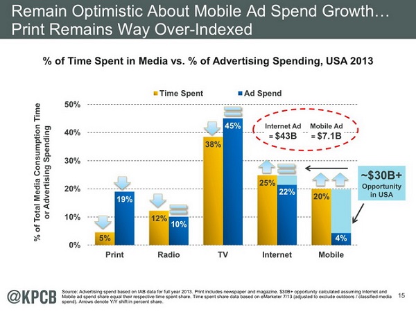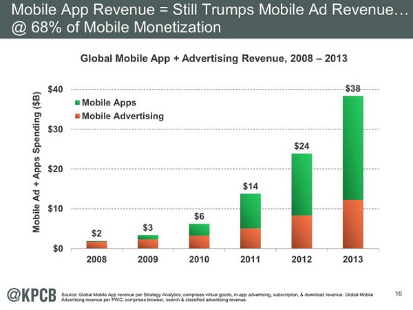 Doanh thu Quảng cáo di động (mobile advertising) vẫn còn ít hơn nhiều so với doanh thu Ứng dụng di động (mobile app) – Nguồn: KPCB