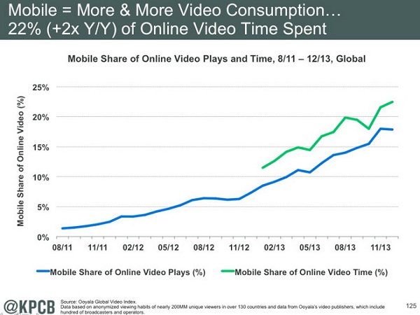 Xem video trực tuyến trên di động và Thời gian xem video trực tuyến trên di động đều tăng – Nguồn: KPCB