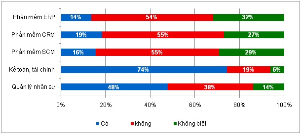 Tỷ lệ doanh nghiệp sử dụng các phần mềm phục vụ trực tiếp hơn cho hoạt động kinh doanh và bán hàng như phần mềm quản trị quan hệ khách hàng (CRM), quản trị nguồn lực doanh nghiệp (ERP) hay quản trị chuỗi cung ứng (SCM) chiếm tỷ trọng khá thấp.