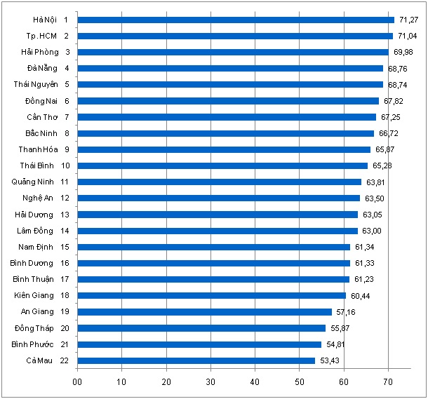 Các thành phố lớn vừa là trung tâm kinh tế vừa tập trung nhiều trường đại học có chỉ số cao nhất về NNL&HT. Hà Nội và Tp. Hồ Chí Minh là hai thành phố dẫn đầu về chỉ số NNL&HT với các điểm số tương ứng là 71,3 và 71,0. Điểm số của tỉnh Thái Nguyên là 68,7 đứng ngay sát hai thành phố trực thuộc Trung ương là Hải Phòng (70,0) và Đà Nẵng (68,8).