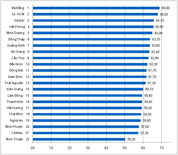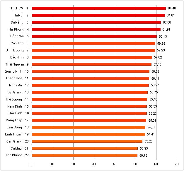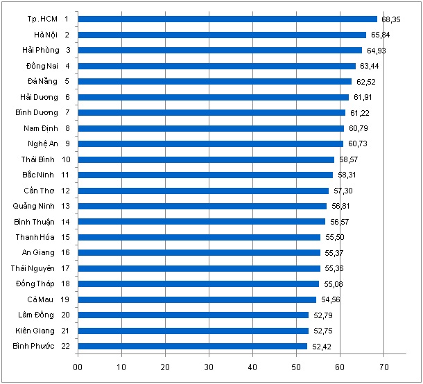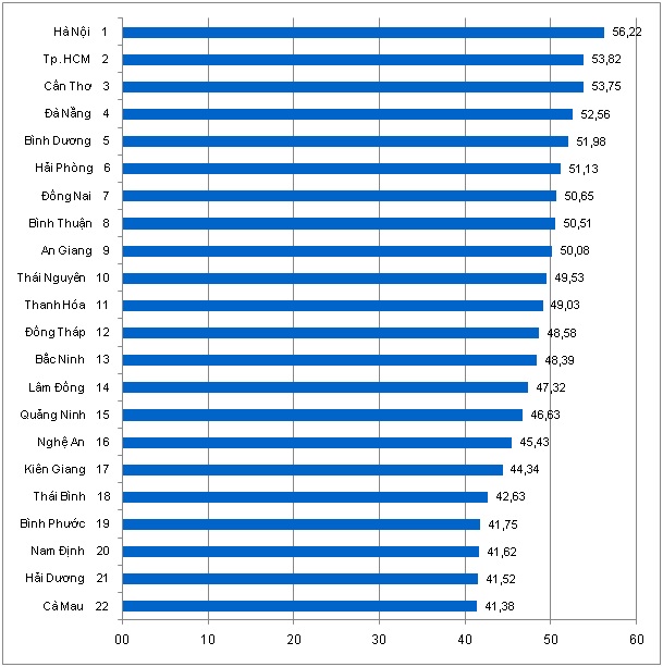 Nhóm 5 địa phương dẫn đầu là Tp. Hồ Chí Minh, Hà Nội, Đà Nẵng, Hải Phòng và Đồng Nai, tiếp ngay sau đó là 3 địa phương gồm Thành phố Cần Thơ, Bình Dương và Bắc Ninh. Như vậy có thể nhận xét các địa phương có mức độ sẵn sàng ứng dụng thương mại điện tử cao nhất là các thành phố trực thuộc Trung ương và các tỉnh năng động và liền kề với hai trung tâm kinh tế lớn nhất nước là Đồng Nai, Bình Dương và Bắc Ninh.