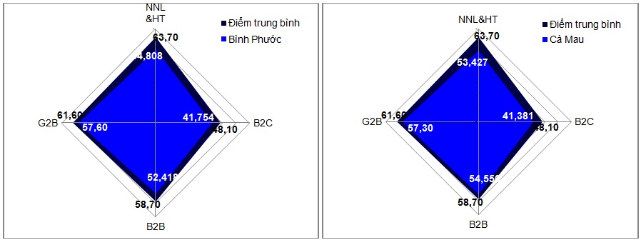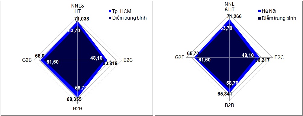 Từ biểu đồ điểm số của hai thành phố dẫn đầu cả nước có thể thấy tất cả bốn nhóm tiêu chí của hai địa phương này đều cao hơn mức trung bình của cả nước. Trong khi điểm số về nguồn nhân lực của hai thành phố bằng nhau thì Tp. Hồ Chí Minh vượt trội hơn Hà Nội một chút về tiêu chí giao dịch G2B và B2B, ngược lại Hà Nội cao hơn về tiêu chí giao dịch B2C.