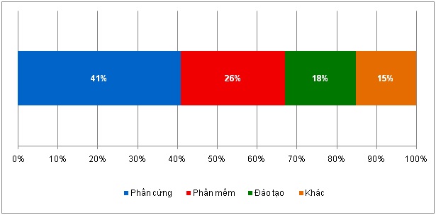 Tính trung bình doanh nghiệp đã dành 41% kinh phí đầu tư cho phần cứng, 26% cho phần mềm. Chi phí cho đào tạo và các hoạt động khác chiếm tỷ lệ tương ứng là 18% và 15%.