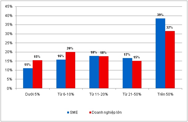 Cuộc điều tra cho thấy không có sự khác biệt lớn của lực lượng lao động thường xuyên sử dụng email giữa các doanh nghiệp lớn và doanh nghiệp SME. Đáng chú ý là tại các doanh nghiệp vừa và nhỏ, tỷ lệ trên 50% lao động thường xuyên sử dụng email trong công việc cao hơn so với các doanh nghiệp lớn. Số liệu này phản ảnh thực tế các doanh nghiệp lớn ở Việt Nam phần nhiều là các doanh nghiệp sử dụng nhiều lao động trong các ngành dệt may, da giày, cơ khí…