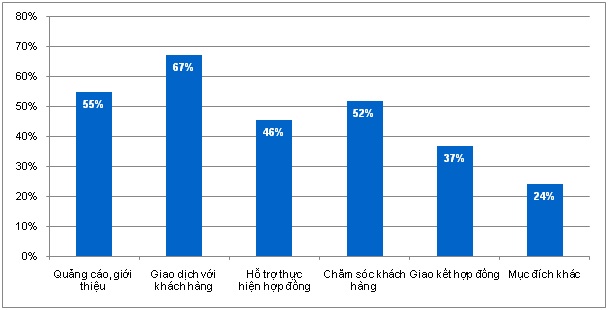 Email được các doanh nghiệp sử dụng ở mức cao để phục vụ hoạt động kinh doanh. Email được sử dụng nhiều nhất cho hoạt động giao dịch với khách hàng với tỷ lệ 67% doanh nghiệp, tiếp đó là sử dụng email để quảng cáo, giới thiệu doanh nghiệp hoặc sản phẩm của doanh nghiệp với tỷ lệ là 55%. Tỷ lệ doanh nghiệp sử dụng email để giao kết hợp đồng chỉ chiếm 37% số doanh nghiệp tham gia điều tra.