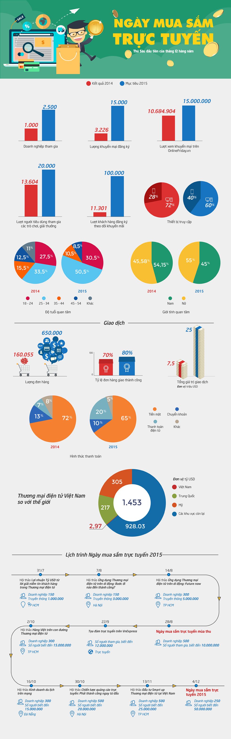 Ngày mua sắm trực tuyến – Online Friday 2015, sự kiện mua sắm trực tuyến lớn nhật tại Việt Nam, Ban tổ chức kỳ vọng tổng giá trị giao dịch vào thứ Sáu ngày 4 tháng 12 sẽ là 25 triệu đô so với 7,5 triệu đô của Ngày mua sắm trực tuyến đầu tiên tổ chức vào năm 2014. Ngay từ bây giờ, các doanh nghiệp có thể vào trang www.onlinefriday.vn để đăng ký tham gia.
