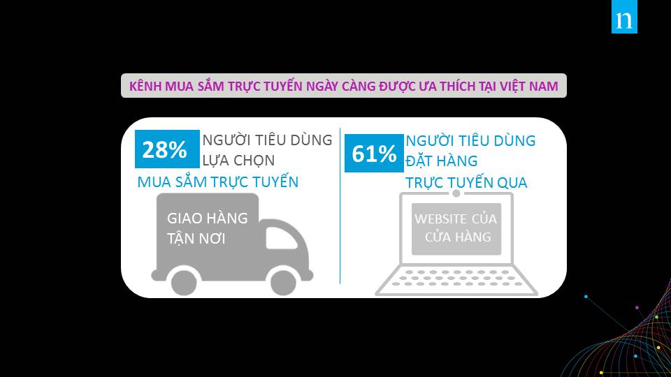 Theo báo cáo của Nielsen về Tương lai của cửa hàng tạp hóa được thực hiện ở 60 quốc gia với hơn 30.000 người trả lời trực tuyến để hiểu các kênh hiện đại và công nghệ kỹ thuật số đang thay đổi thị trường bán lẻ như thế nào. Và khi nói đến mua sắm trực tuyến, 61% người tiêu dùng Việt cho rằng trang web là nơi ưa thích nhất được vào sử dụng để đặt hàng.