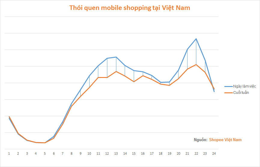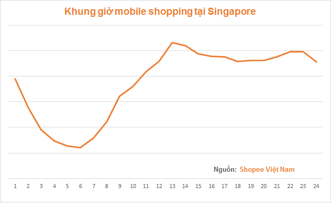 Một điều khá thú vị tại thị trường Việt Nam khác biệt với một số quốc gia là sự chênh lệch giữa giờ cao điểm và thấp điểm khi shopping. Ở các thị trường khác của Shopee, ví dụ như Singapore hoặc Malaysia, khi tăng đến mức cao vào giờ nghỉ trưa, số lượng người mua sắm trên di động có xu hướng giữ nguyên cho đến giờ đi ngủ. Tuy nhiên, tại Việt Nam, con số này giảm sâu vào khoảng thời gian 6 – 7 giờ tối, chỉ bằng 60% so với thời điểm 10 – 11 giờ đêm.