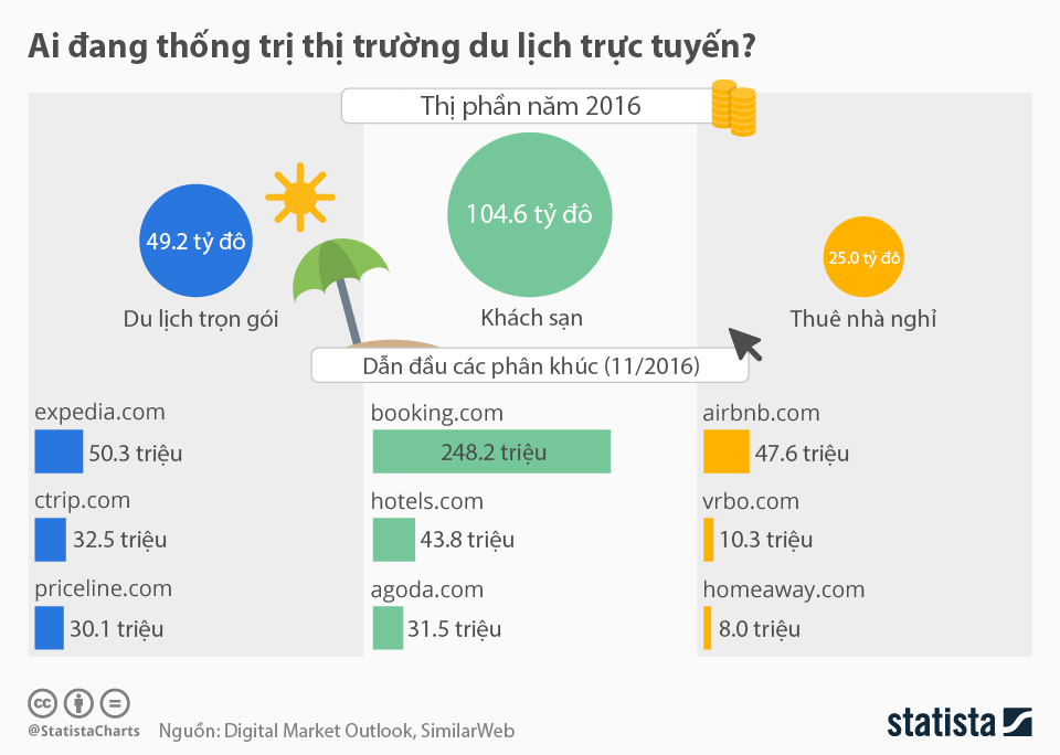 Theo Outlook Statista, tổng thị phần của lĩnh vực du lịch trực tuyết rất lớn, ước tính vượt qua 175 tỷ đô trong năm 2016 bao gồm 3 phân khúc dẫn đầu: du lịch trọn gói, thuê nhà nghỉ, khách sạn. Sau đây là infographic “những nhà cung cấp dịch vụ đứng đầu trong lĩnh vực du lịch trực tuyến”.