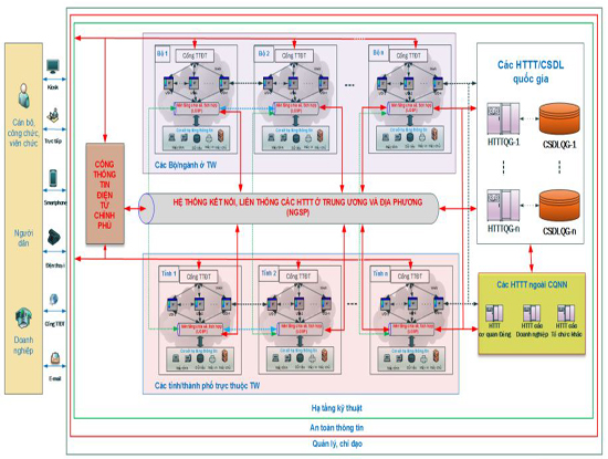 Cụ thể, theo Khung Kiến trúc CPĐT Việt Nam phiên bản 1.0 mới được ban hành, căn cứ từ yêu cầu kết nối giữa các cấp quản lý hành chính nhà nước (Trung ương, tỉnh, quận/huyện và phường/xã – PV), thực tế phát triển CPĐT của Việt Nam và cơ sở phương pháp luận về Khung Kiến trúc CPĐT. Bộ TT&TT đã đưa Sơ đồ tổng thể Khung Kiến trúc CPĐT Việt Nam với các thành phần chính gồm: Người sử dụng; Kênh giao tiếp; Cổng thông tin điện tử Chính phủ; Hệ thống kết nối, liên thông các hệ thống thông tin ở Trung ương và địa phương; Kiến trúc CPĐT của Bộ/ tỉnh; Các hệ thống thông tin/ cơ sở dữ liệu quốc gia; Các hệ thống thông tin ngoài cơ quan nhà nước; Hạ tầng kỹ thuật; Quản lý, chỉ đạo; An toàn thông tin. Sơ đồ này cũng thể hiện tổng thể sự kết nối của các hệ thống thông tin các cấp.