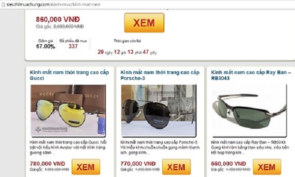 Như trên trang web: sieuthimuachung.com, trang web này rao bán hàng loạt sản phẩm kính mắt thương hiệu “sang chảnh” như Cartier X-Men, Gucci, Rayban, Porsche…Điển hình như chiếc kính nhãn hiệu Rayban được nhiều người ưa chuộng được giới thiệu nổi bật với kiểu kính Aviator, mắt kính tráng gương bán với giá 780.000 đồng. Kính nhãn hiệu porsche chỉ có giá 770.000 đồng.