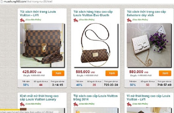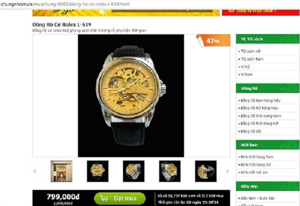 Trên trang web khác như chungnhom.vn, một chiếc đồng hồ có nhãn hiệu sang trọng Rolex được bán với mức giá 799.000 đồng, rẻ hơn rất nhiều so với giá bán hàng chính hãng. Tại trang web này cũng bán vô số các mặt hàng túi xách, kinh mắt hàng hiệu với giá “rẻ như bèo”.