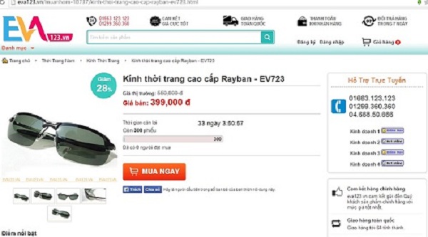 Rẻ mạt hơn, trên trang bán hàng eva123.vn còn bán chiếc kính nhãn hiệu Rayban với giá 399.000 đồng và còn kèm theo lời cam kết hàng chính hãng ngay trên trang web.