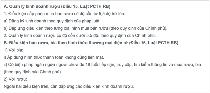 Luật Phòng chống tác hại của rượu, bia (PCTH RB) có hiệu lực từ ngày 01/01/2020 cho phép các doanh nghiệp được bán rượu bia trực tuyến khi tuân thủ một số điều kiện nhằm giảm tác hại của việc lạm dụng rượu, bia. Điều kiện mua bán rượu bia trực tuyến được quy định tại Điều 16 “Điều kiện bán rượu bia theo hình thức thương mại điện tử”. Điều này quy định việc bán rượu bia phải áp dụng hình thức thanh toán không dùng tiền mặt và người bán trực tuyến phải thực hiện biện pháp theo quy định của Chính phủ để ngăn ngừa người chưa đủ 18 tuổi tiếp cận, truy cập, tìm kiếm thông tin mua rượu, bia. Ngoài ra, việc kinh doanh rượu còn phải tuân thủ Điều 15 “Quản lý kinh doanh rượu”.