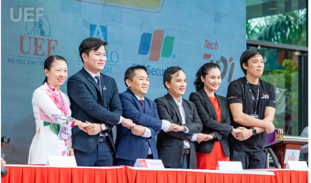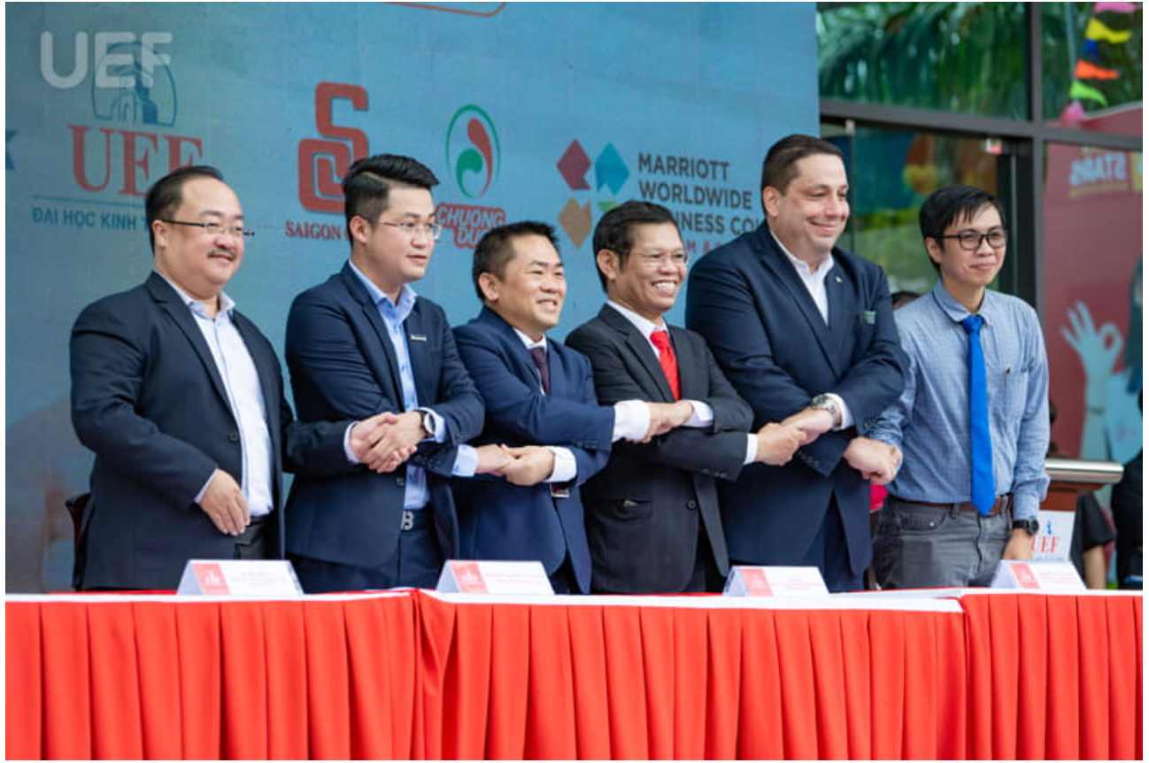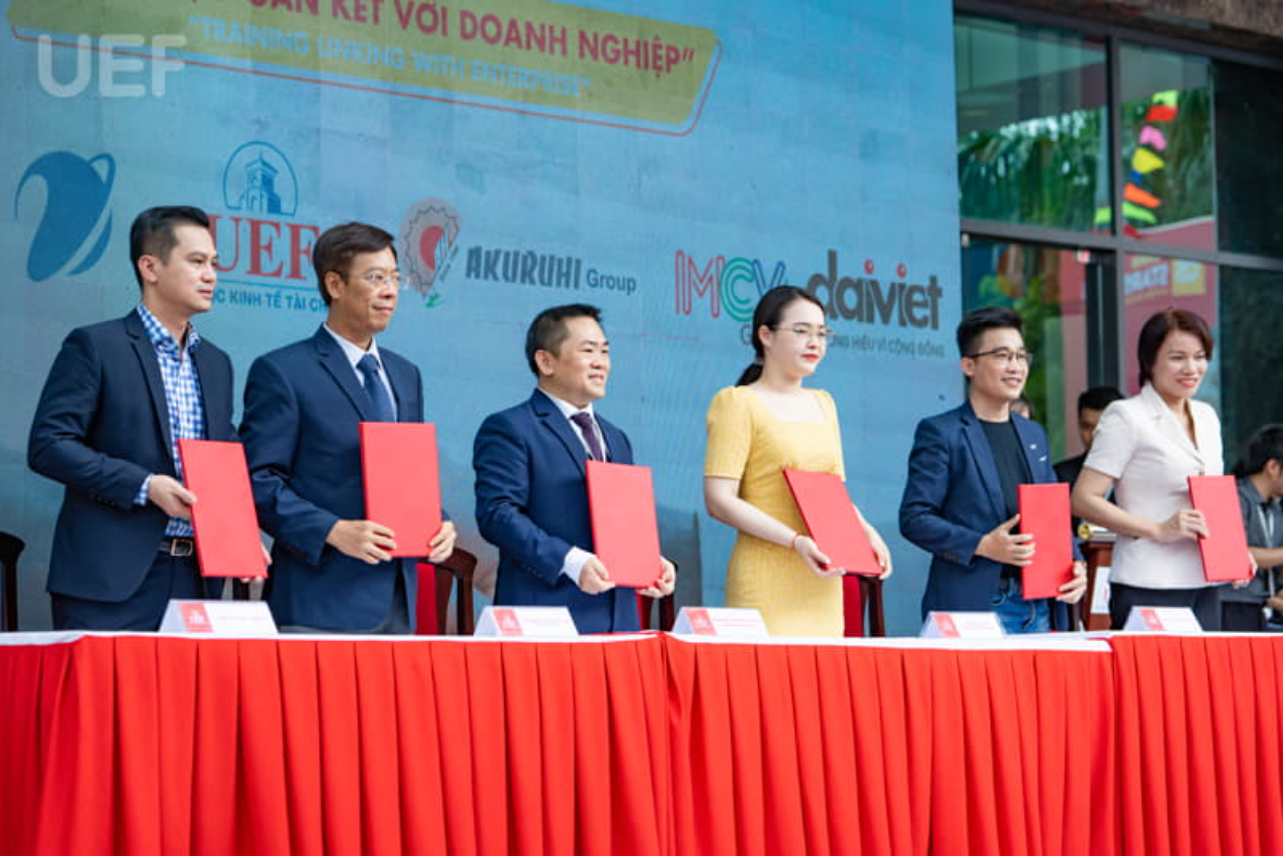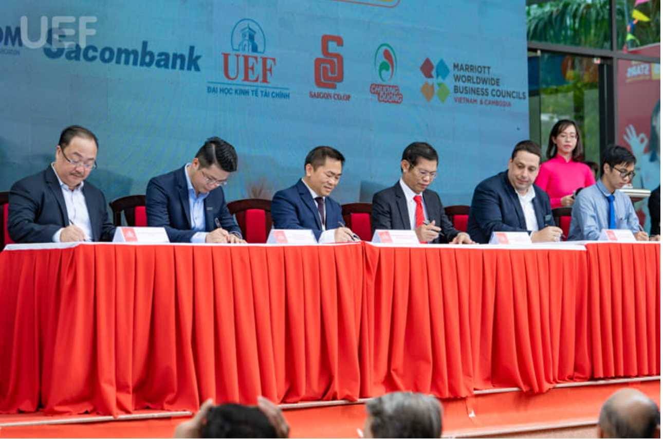 Nghi thức ký kết được thực hiện sau đó, đại diện UEF, PGS.TS. Ngô Cao Cường – Phó Hiệu trưởng thường trực Nhà trường ký kết cùng đại diện 15 doanh nghiệp gồm: Ngân Hàng TMCP Sài Gòn Thương Tín – Sacombank, Hiệp Hội Thương Mại Điện Tử (VECOM), Liên Hiệp Hợp Tác Xã Thương Mại TP.HCM (Saigon Co.op), Công ty CP Nước Giải Khát Chương Dương, Công ty TNHH JOBTest, Trung tâm kinh doanh VNPT TP.HCM, Công ty TNHH Phan Thành Akuruhi, Công ty CP Tập Đoàn MCV, Công ty sản xuất tập đoàn Đại Việt, Aeon Việt Nam, Công ty CP Đất Xanh Premium, Tổ chức Giáo dục và Đào tạo Apollo English Việt Nam, Công ty CP Chứng Khoán FPT, Công ty TNHH Tech JDI, Hội đồng Kinh Doanh Việt Nam – Campuchia - Tập đoàn Marriott International.