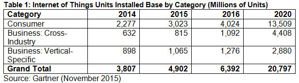Thống kê số lượng thiết bị kết nối vào mạng IoT toàn cầu năm 2014, 11/2015 và dự báo năm 2016 và 2020