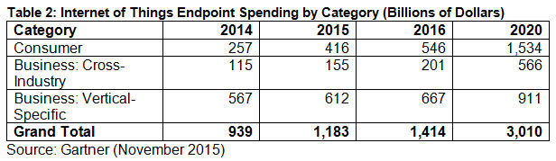 Tuy nhiên, thống kê mới đây của Gartner cho thấy cả khách hàng cá nhân và doanh nghiệp ngày càng mạnh tay chi tiền để sử dụng dịch vụ này.Cụ thể, họ sẵn sàng bỏ ra 939 tỷ USD để kết nối 3,8 tỷ thiết bị vào mạng IoT vào năm 2014. Số tiền này tăng lên thành 1.183 tỷ vào tháng 11/2015 và được dự báo sẽ tăng lên thành 1.414 vào năm sau.