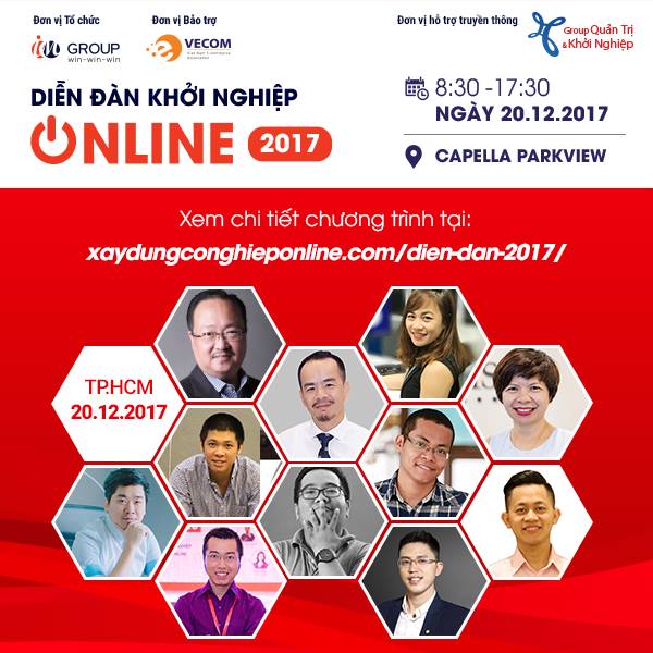 Ngày 20 tháng 12 tại Tp. Hồ Chí Minh, sẽ diễn ra sự kiện “Diễn đàn khởi nghiệp online 2017” – đây sẽ là sự kiện lớn nhất với những chia sẻ với những công thức cụ thể tạo tiền đề thành công cho năm 2018. Dưới sự bảo trợ của Hiệp hội Thương mại Điện tử Việt Nam, IMGroup chính thức tổ chức sự kiện với có mặt của nhiều chuyên gia có uy tín trong ngành thương mại điện tử như: Sendo, Nielsen, Zalo, Z.com, Palto, Vietguys…