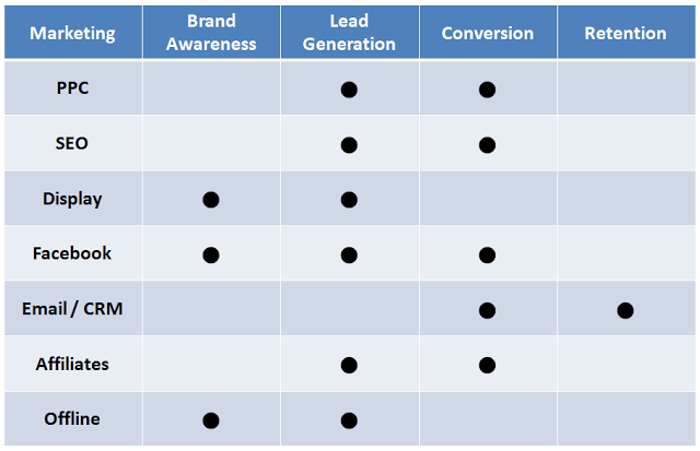 Rồi, pro marketers sẽ tiếp tục lồng lộn lên: Ai nói PPC không tốt cho branding, Facebook không tốt cho traffic tái mua hàng, Display network, đặc biệt là Re-targeting mà không tốt cho Sales à? Vâng, các bạn bình tĩnh nghe mình nói nốt, cái này là bản tóm tắt chung nhất cho các thế mạnh nhất của từng kênh marketing bạn nhé! Nếu bạn đã lấy lại bình tĩnh, mình xin được phép nói thêm về cách khai thác từng kênh một, và đo lường hiệu quả của từng kênh.
