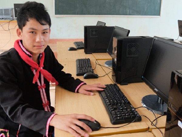 Em Lỳ Xoan Lòng, người dân tộc Hà Nhì, học sinh lớp 9 trường phổ thông Dân tộc bán trú THCS Chung Chải, huyện Mường Nhé, lần đầu tiên trong đời được chạm tay vào máy tính.