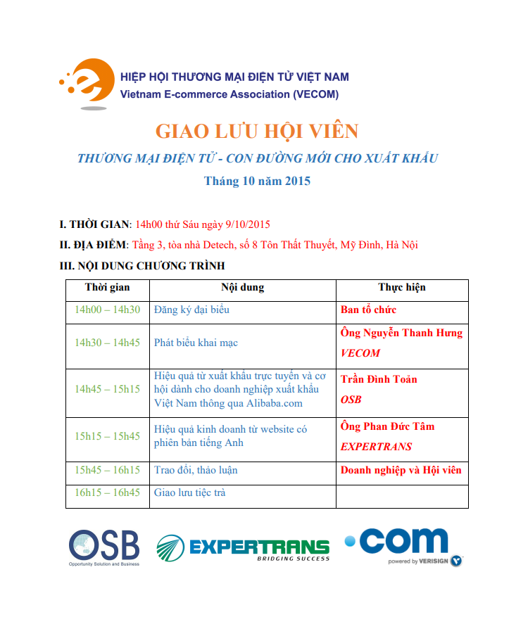 Buổi giao lưu hội viên, doanh nghiệp trong lĩnh vực xuất khẩu, sản xuất, kinh doanh thương mại điện lần này sẽ được công ty OSB hỗ trợ công cụ tiếp cận thị trường xuất khẩu thông qua sàn thương mại điện tử Alibaba. Công ty dịch thuật toàn cầu Expertrans sẽ đưa ra các giải pháp về website doanh nghiệp xuất khẩu cần có sự khác biệt gì về nội dung, ngôn ngữ cần được chuẩn hóa ra sao, hiệu quả đem lại từ website có ngôn ngữ chuẩn hóa,… Tại buổi giao lưu, các hội viên sẽ có cơ hội nhận các phần quà may mắn.