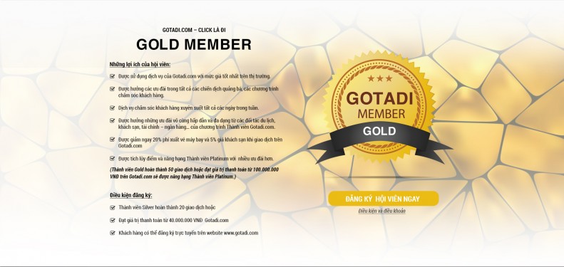 Gotadi.com áp dụng các chính sách ưu đãi khác nhau tùy theo hạng Thành viên Silver/Gold/Platinum của khách hàng. Từ nay đến ngày 15/8/2016, thành viên của VECOM đăng ký chương trình Thành viên Gotadi.com sẽ được ưu tiên nâng cấp lên hạng Gold. Thành viên hạng Gold được giảm thêm 20% phí xuất vé máy bay và 5% giá khách sạn. Để đăng ký trở thành Thành viên Gold của Gotadi.com, Quý khách thực hiện như sau: