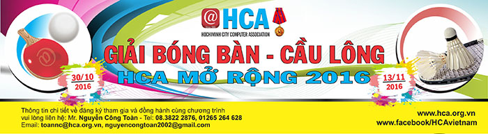 HCA mong nhận được sự quan tâm đồng hành và tham dự của Quý doanh nghiệp, đối tác; góp phần tạo nên thành công của Giải Bóng bàn và Cầu lông HCA 2016.
