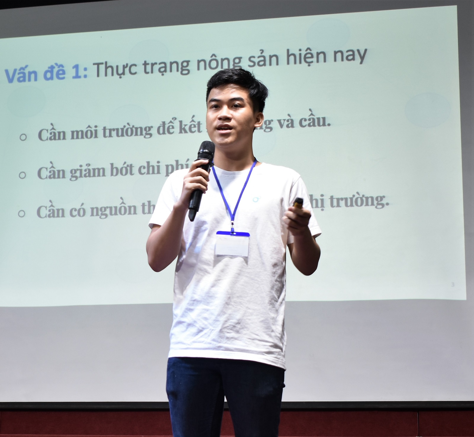 Đại diện nhóm sinh viên ĐH Bách Khoa trình bày giải pháp nhằm giúp nông sản Việt mang về lợi ích lớn hơn cho người nông dân.