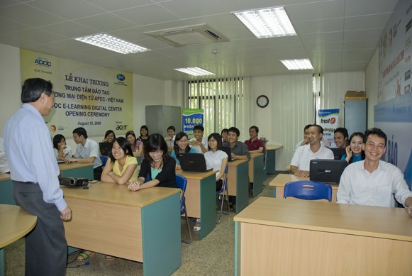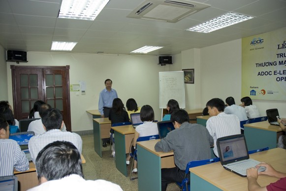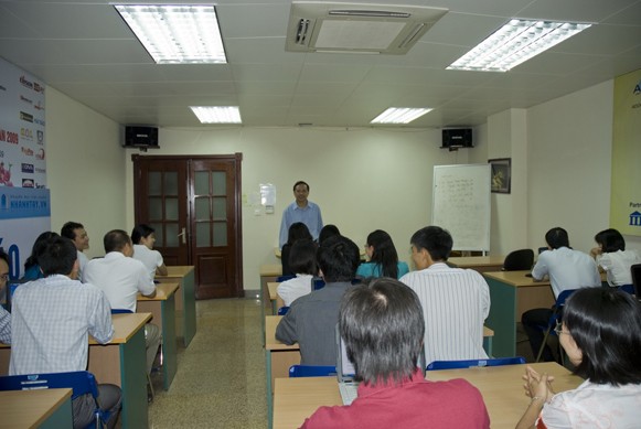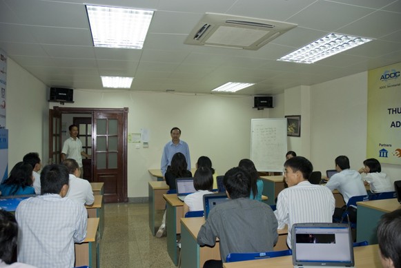 Chủ tịch VECOM Lương Văn Tự trao đổi thân mật với các học viên tại một khóa đào tạo tại Trung tâm Đào tạo Thương mại điện tử ADOC tháng 8 năm 2009