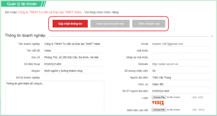 Tại đây doanh nghiệp có thể cập nhật thông tin, đăng các Khuyến mãi và quản lý danh sách Sản phẩm khuyến mãi của mình.