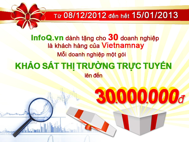 Nhằm giúp các doanh nghiệp Việt Nam có được thông tin về thị trường, hiểu được mong muốn của khách hàng, InfoQ.vn – website khảo sát thị trường hàng đầu tại Việt Nam do công ty cổ phần GMO RUNSYSTEM phối hợp với VIETNAMNAY.COM triển khai chương trình “Tặng 30 gói khảo sát thị trường trực tuyến miễn phí cho 30 doanh nghiệp là thành viên doanh nghiệp của Vietnamnay, mỗi gói khảo sát trị giá lên đến 30 triệu đồng”.