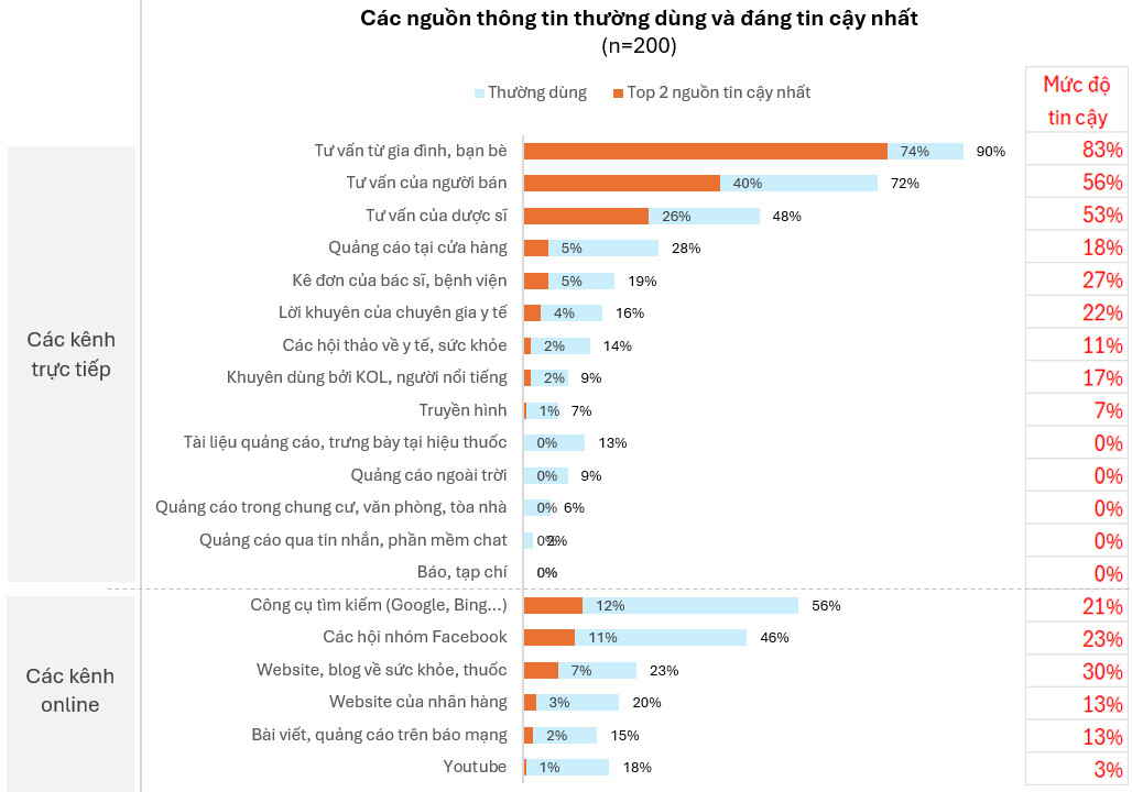 (b) Không chỉ thiếu thông tin, tình trạng quảng cáo giả và sai sự thật tràn lan cũng khiến người tiêu dùng trở lên nghi ngại hơn. Không giống các loại thuốc được kê đơn kèm theo chỉ định rõ ràng của bác sĩ, thực phẩm chức năng chủ yếu do người dùng tự chọn mua, vì thế nỗi lo về hàng nhái, kém chất lượng gây hại cho sức khỏe cũng rõ rệt hơn. Từ đó, người tiêu dùng có xu hướng tin tưởng nhất vào lời khuyên từ gia đình, bạn bè và những người xung quanh. Các kênh trực tuyến tuy được dùng rộng rãi để tìm kiếm thông tin nhưng mức độ tin cậy tương đối thấp. Dù vậy, cũng không thể bỏ qua một chi tiết, đó là các nguồn thông tin online quen thuộc như công cụ tìm kiếm, mạng xã hội, người nổi tiếng hay KOL vẫn có sức ảnh hưởng nhất định (gần ngang với tư vấn của chuyên gia y tế).