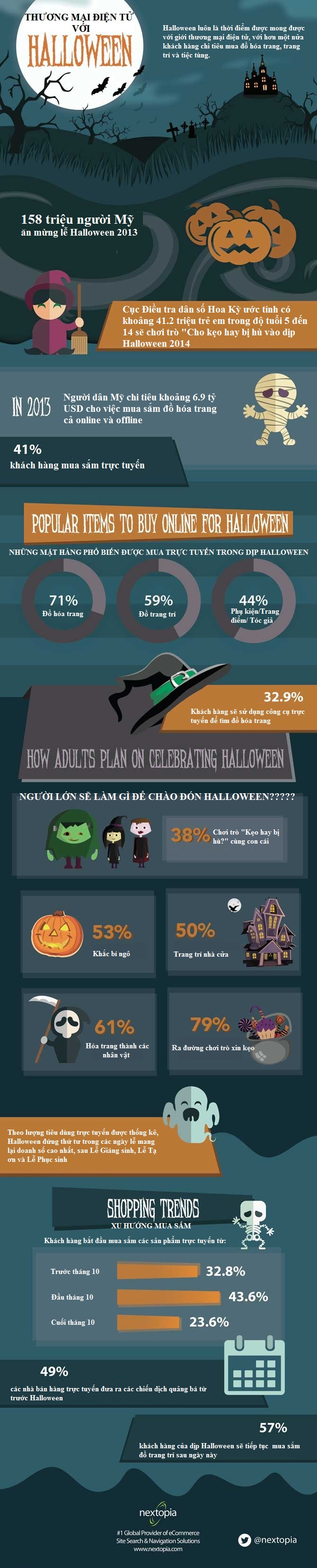 Mặc dù Halloween là một ngày lễ truyền thống ở phương Tây, nhưng trong thời đại số và xu hướng hội nhập, giao thoa giữa các nền văn hóa hiện nay, Lễ hội ma cũng đang dần dần du nhập vào Việt Nam và được nhiều người, đặc biệt là giới trẻ đón nhận. Vì thế, các nhà bán hàng cần cân nhắc nhu cầu của các khách hàng trong thời điểm này, thông qua việc nghiên cứu hành vi và trải nghiệm tiêu dùng của khách hàng tại các thị trường lâu đời. Hãy cùng xem cách mua sắm của người tiêu dùng trong dịp Halloween tại thị trường Hoa Kỳ, một trong những quốc gia dẫn đầu về thương mại điện tử, thông qua Infographic dưới đây (Nguồn: Nextopia).