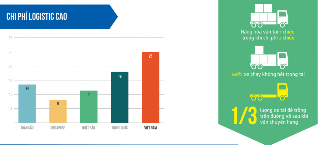 Chi phí Logistics của Việt Nam đang ở mức rất cao so với các nước có trình độ phát triển tương đồng trong khu vực và trên thế giới. Nguyên nhân chủ yếu dẫn đến tình trạng này là do tổ chức vận tải còn lạc hậu, tỷ lệ xe chạy “rỗng” trêm đường về chiếm đến 30-50%.