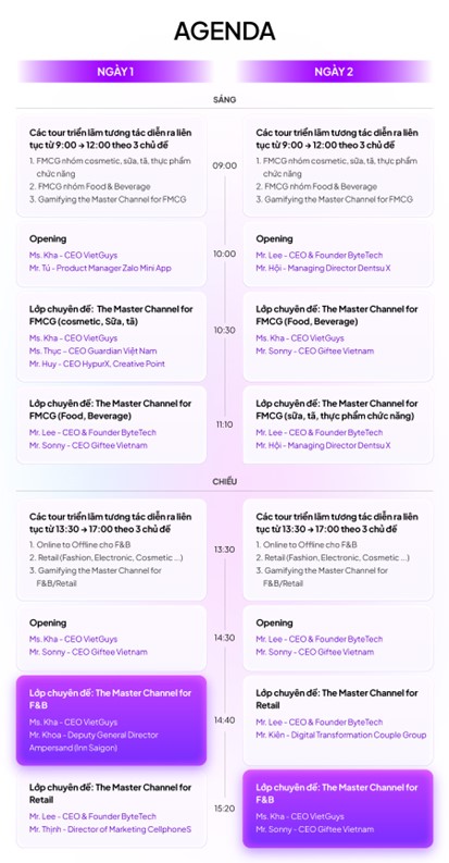 Là triển lãm tương tác trực tiếp với hàng loạt kịch bản demo xuyên suốt, mô phỏng hành trình mua hàng và dòng chảy của dữ liệu từ Online đến Offline diễn ra trong 2 ngày với các “demo tour” và lớp học chuyên đề như sau: