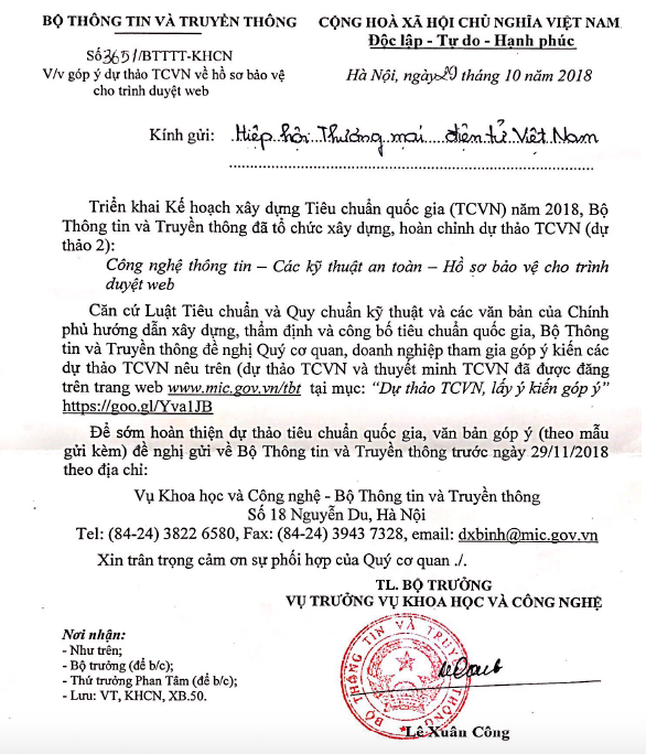 Để sớm hoàn thiện dự thảo tiêu chuẩn quốc gia, văn bản góp ý (theo mẫu gửi kèm) đề nghị gửi về Bộ Thông tin và Truyền thông trước ngày 29/11/2018 theo địa chỉ :