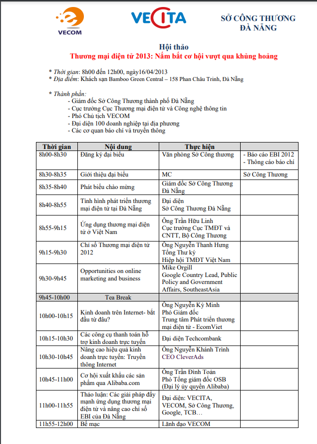Nối tiếp thành công Hội thảo Thương mại điện tử 2013 tại Hải Phòng, Hiệp hội Thương mại điện tử Việt Nam (VECOM) phối hợp với Sở Công Thương Đà Nẵng và Cục Thương mại điện tử và Công nghệ thông tin tổ chức Hội thảo “Thương mại điện tử 2013: Nắm bắt cơ hội vượt qua khủng hoảng”:
