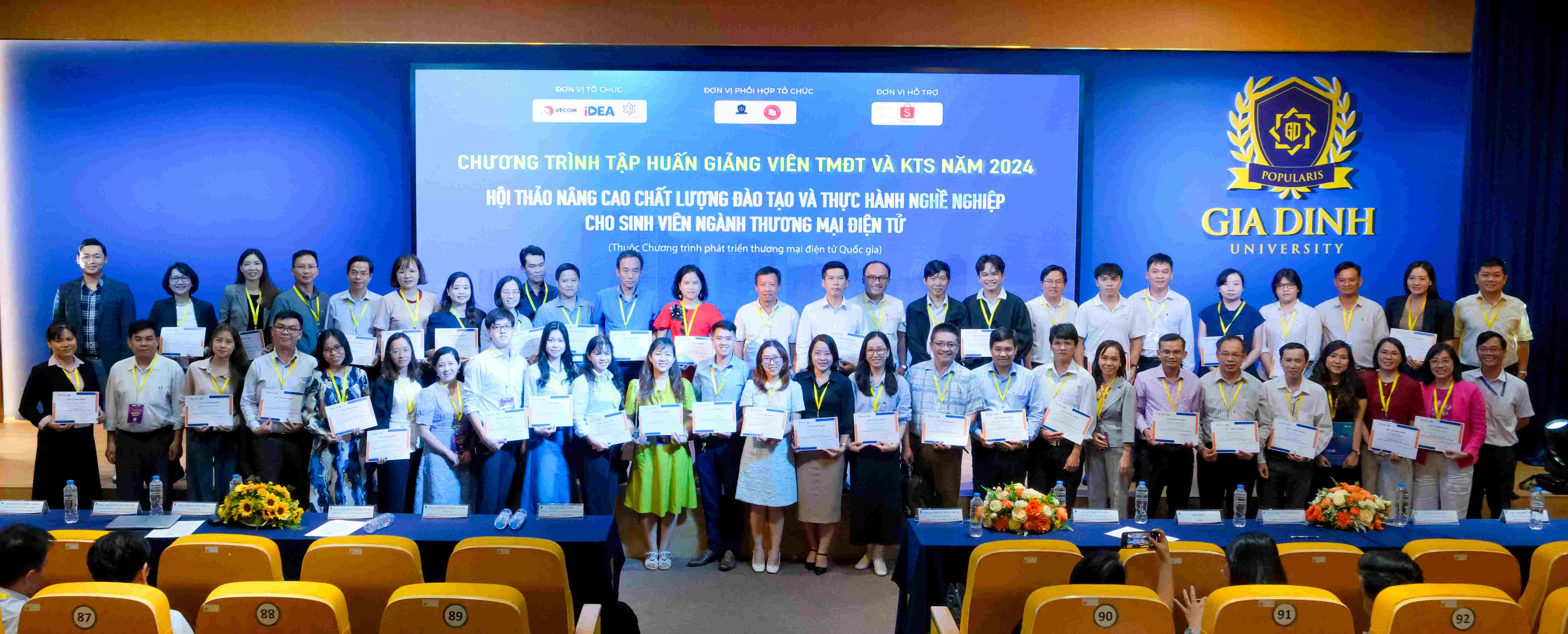 Kết thúc khóa đào tạo, gần 400 giảng viên tại TP. HCM và Hà Nội đã được nhận chứng chỉ tham gia Chương trình. Ban tổ chức xin gửi lời cảm ơn sự hỗ trợ và tham gia của Quý Thầy/Cô, điều này đã góp phần quan trọng vào thành công của chương trình. Ban tổ chức hy vọng rằng những chia sẻ từ doanh nghiệp không chỉ giúp Quý Thầy/Cô có cái nhìn sâu sắc hơn về thực tiễn ngành thương mại điện tử mà còn mở rộng kiến thức cho các ngành liên quan khác. Từ đó, những thông tin này sẽ góp phần nâng cao chất lượng đào tạo và định hướng tốt hơn cho sinh viên trong quá trình học tập và phát triển nghề nghiệp.