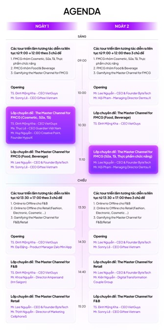 Là triển lãm tương tác trực tiếp với hàng loạt kịch bản demo xuyên suốt, mô phỏng hành trình mua hàng và dòng chảy của dữ liệu từ Online đến Offline diễn ra trong 2 ngày với các “demo tour” và lớp học chuyên đề như sau: