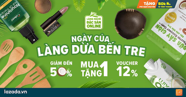 – Lazada dành tặng 50.000 VNĐ phí vận chuyển cho tất cả các đơn hàng từ 99.000 VNĐ đặt mua các sản phẩm của làng dừa Bến Tre trong ngày này trên toàn quốc.