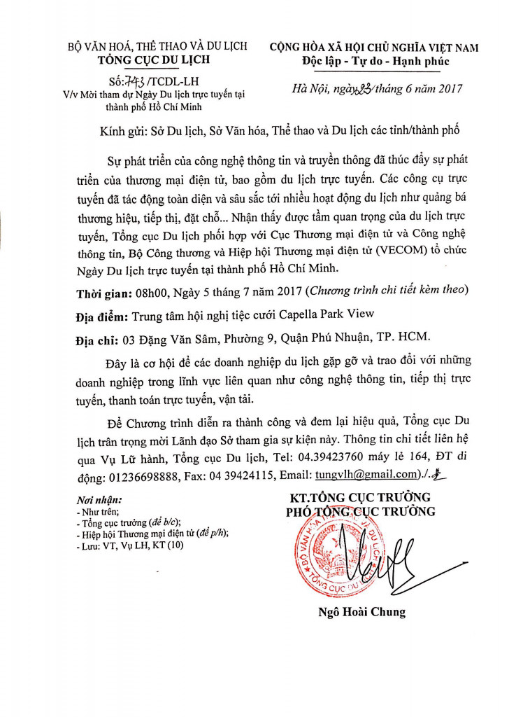 Ngày 05/7/2017 tới đây, Hiệp hội Thương mại điện tử Việt Nam (VECOM) phối hợp với Tổng cục Du lịch và Cục Thương mại điện tử và Công nghệ thông tin sẽ tổ chức Ngày Du lịch trực tuyến tại TP. Hồ Chí Minh.