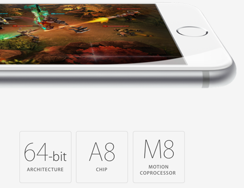 Trong khi các dòng điện thoại Android mới bước vào cuộc đua trang bị bộ vi xử lý 64-bit thì Apple đã đi trước một bước với việc tích hợp bộ vi xử lý 64-bit thế hệ thứ 2 cho bộ đôi điện thoại iPhone 6 của mình. Apple sử dụng chip xử lý A8 với công nghệ sản xuất trên dây chuyền 20 nanomets với 2 tỷ bóng bán dẫn bên trong. Nhờ đó, hiệu suất hoạt động của máy nhanh hơn iPhone thế hệ đầu tiên lên tới 50 lần và 84 lần về tốc độ xử lý đồ hoạ.