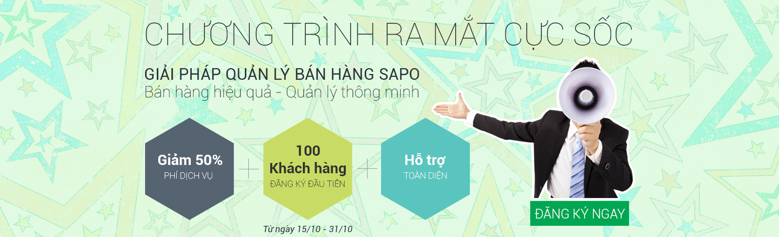 Để tạo cơ hội cho khách hàng có điều kiện được trải nghiệm các tính năng mới và tuyệt vời nhất của phần mềm quản lý bán hàng, bên cạnh chính sách đăng ký dùng thử miễn phí trong 15 ngày, Sapo.vn triển khai chương trình khuyến mãi 50% phí dịch vụ cho 100 khách hàng đăng ký đầu tiên nhân dịp giới thiệu ra mắt bộ sản phẩm (thời gian từ 15/10 – 31/10).