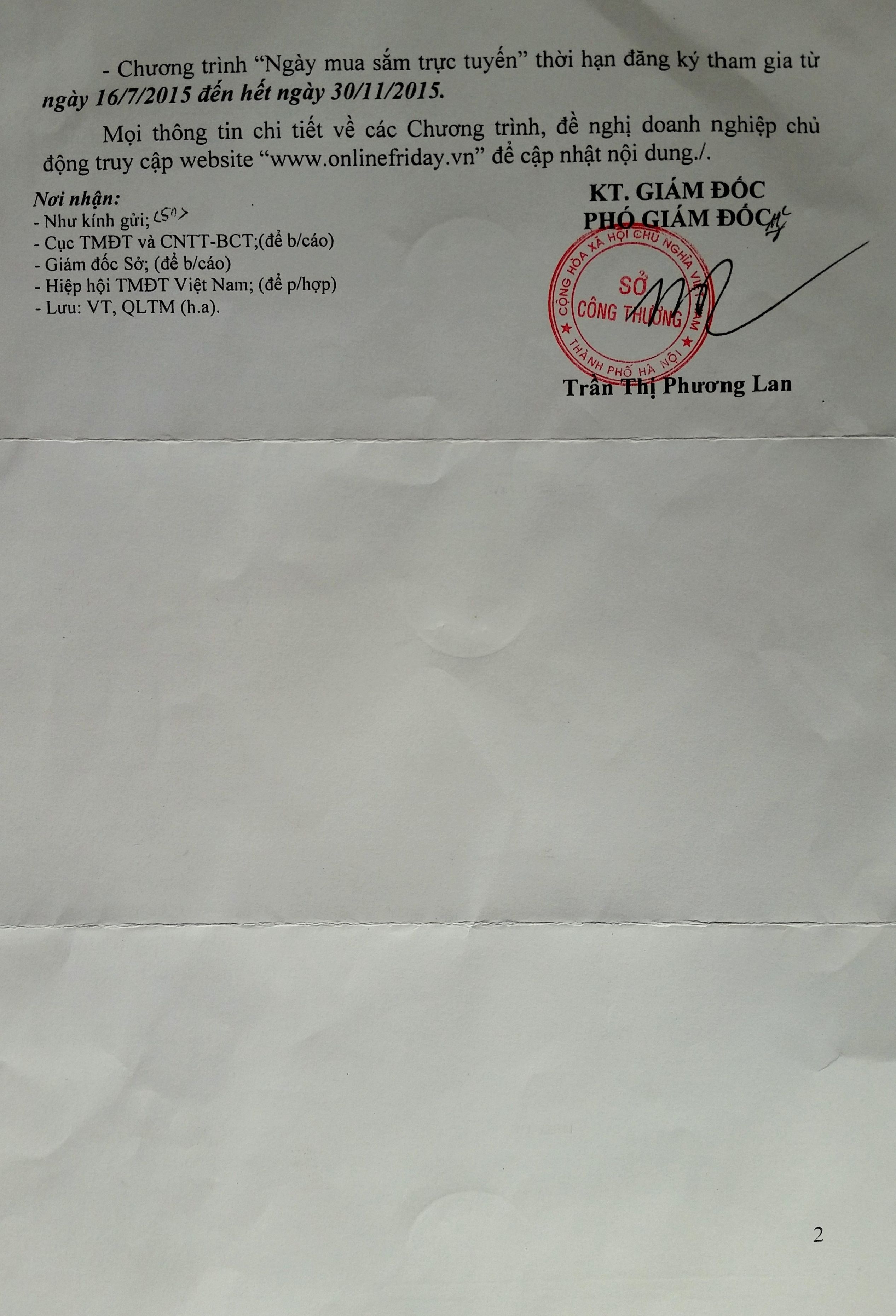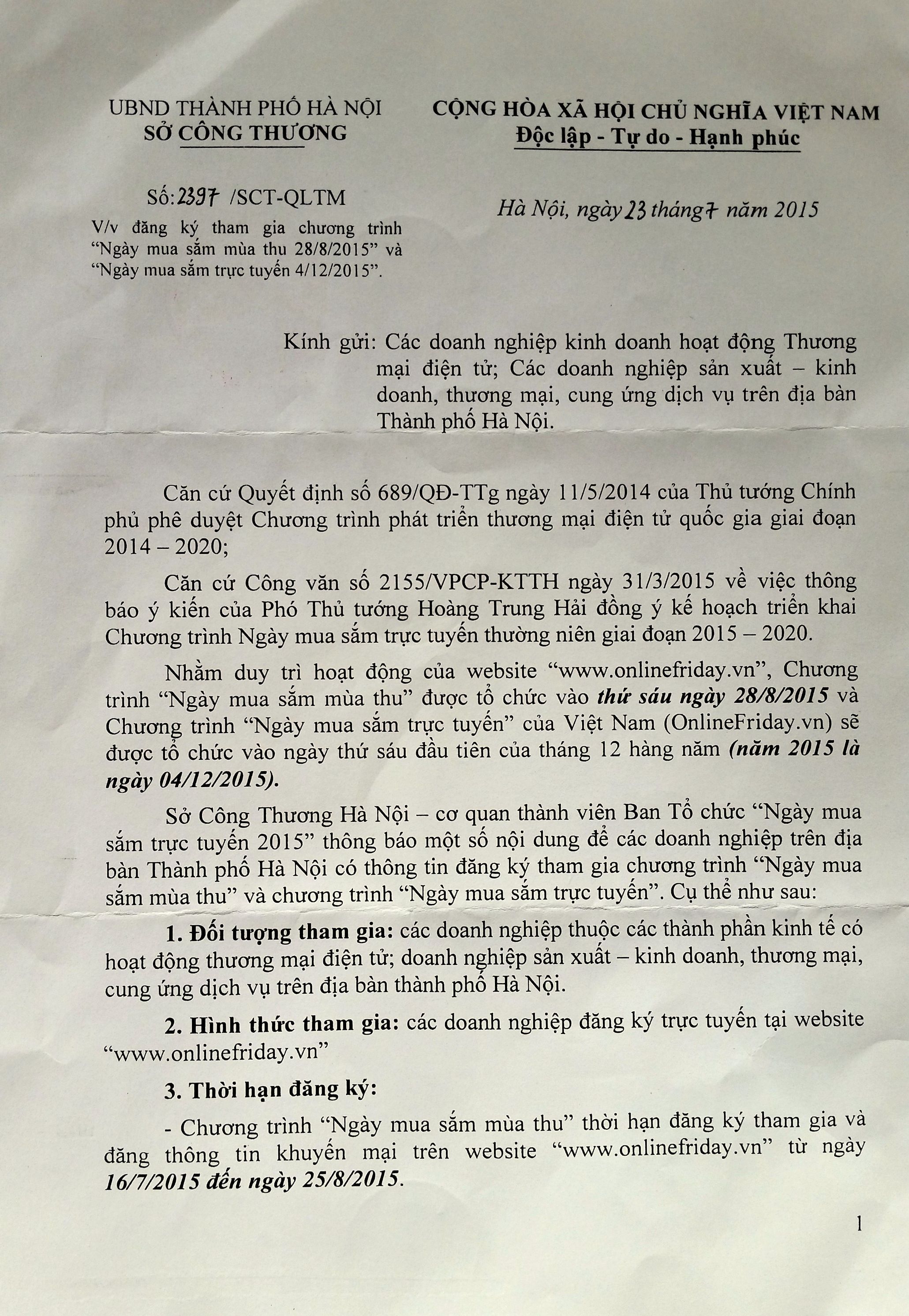 Ngày 23 tháng 7, Sở Công Thương thành phố Hà Nội ra công văn số 2397/SCT-QLTM về việc mời các doanh nghiệp kinh doanh hoạt động Thương mại điện tử; các doanh nghiệp sản xuất – kinh doanh, thương mại, cung ứng dịch vụ trên địa bàn đăng ký tham gia chương trình “Ngày mua sắm mùa thu 28/08/2015” và “Ngày mua sắm trực tuyến 4/12/2015”.