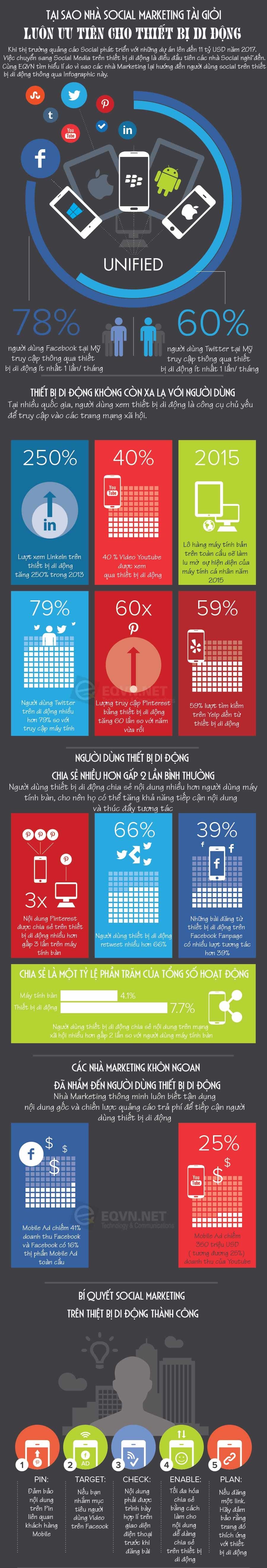 Khi tiến hành những chiến dịch làm Social Marketing nên ưu tiên thiết bị di động vì sự tăng trưởng mạnh mẽ của thị trường smartphone trong thời gian vừa qua đã kéo theo hàng loạt người dùng truy cập internet bằng điện thoại. Trong số đó phần lớn thời gian họ dùng để giải trí và xem tin tức trên các mạng xã hội.