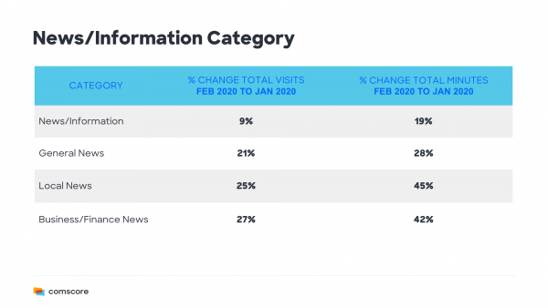 Tin tức tổng hợp và Tin tức địa phương lần lượt tăng 21% và 25%, trong các lượt tuy cập vào tháng 2 so với tháng 1 năm 2020. Về mặt thời gian ghé thăm dành cho Tin tức địa phương tăng 45% và Tin tức tổng hợp tăng 28%